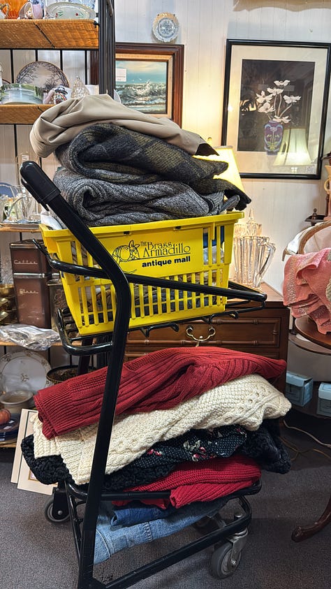 Antique Malls: If you’re looking for true vintage (50 years or more), then you will have a blast at an antique mall. Don’t get discouraged if there aren’t a lot of booths with clothing. You have to be open minded at an antique mall. If your list has jewelry and accessories for the home, you’re going to love the types of treasures you can uncover here. You will need hours of time, as most antique malls are thousands of square footage and hundreds of vendors. Get your iced coffee, find the nearest bathroom upon entering, and put on a podcast. Your anxiety will melt away. Hot tip: When you’re at the check-out counter, ask your sales associate if they have a state Antique Mall map. Most of them do. I’ve collected Illinois, Indiana, and Michigan’s maps so far and keep them in our car’s glove compartment.